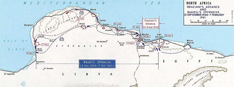 7 December 1940. Operation COMPASS - The British 7th Armoured Division, Indian 4th Infantry Division and British 16th Infantry Brigade advance into Italian-held Libya to begin the North African Campaign. By 15 December, the Western Desert Force has captured Sidi Barrani, taken 38,000 Italian prisoners and captured 400 artillery pieces, plus 50 tanks, while suffering casualties of 133 killed, 387 wounded and 8 missing. The Australian 6th Division captures Bardia, whilst the 7th Armoured Division begins the advance to surround Tobruk.