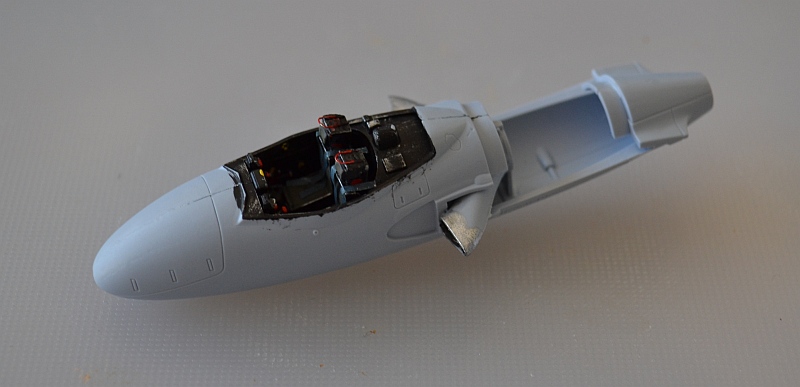 Assembly is straightforward, but it is important to follow the suggested sequence to ensure that everything fits. I had some difficulties with the position of the internal intake trunks (I seem to have fitted them slightly too low) with the result that I had some trouble fitting the lower wings. My external intakes were also a little out of position, needing a little filler to hide the gaps. Airfix supply 2 pilot figures, who look a little too modern for my tastes, so have been swapped for some older ones (who now look a little short!). The very fine 3-part canopy assembly, which can be posed open or shut, is one of the most impressive parts of the kit but also one of the trickiest. The plastic is really very thin (almost vac-form in dimensions); as a result you have to be extremely careful when separating it from the sprue, especially as the sprue attachments are in fairly tricky and critical positions (on all 3 parts). This is helped by the unusually flexible and resilient translucent plastic, but could be problem for the less dextrous or patient modeller!