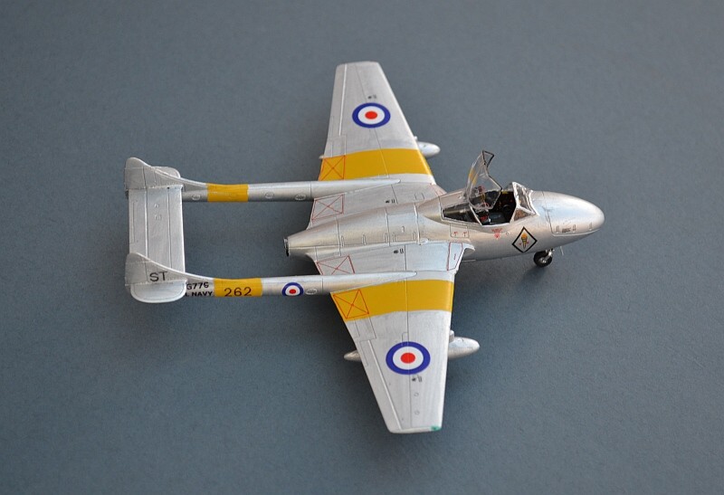 Paint is the same approach as before - brush applied white spirit thinned Humbrol polished Aluminium and Matt Yellow (24) for the trainer bands, with Klear top-coats to finish and seal in the decals. I've seen a couple of builds elsewhere with a well weathered look and dark panel lines which don't gel with the photos I have found, so I have left this one clean and well tended. Transfers (decals) are once more a mix of the generic kit markings, plus a few home made inkjet serials and titles. Note that whilst the kit scheme has a matt black glare panel in front of the canopy, the RN aircraft don't seem to have had this.