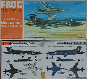 FROG 1/72 with Modeldecal markings & Airwaves PE The Buccaneer has seen a lot of attention from kit manufacturers over the years, with offerings from Airfix (NA.39 and S.2 in 1/72 plus S.2 in 1/48), Matchbox and FROG, as well as some excellent (but costly) Czech resin kits. Unfortunately none of them, except perhaps the Czechs, have got the Buccaneer's complex curves entirely right. Nevertheless there is a multitude of after market correction sets available from time to time for the enthusiast to correct some of the most obvious kit issues. This is the FROG kit, first issued in 1972, which represents an early variant without the extended and bulged bomb bay fuel tank. I'm not sure that I've ever seen one of these built before and equally I don't think I have ever seen a Russian re-pop for sale either. As supplied the kit provides decals for an RAF machine with Martel anti-ship missiles and a South African aircraft. |