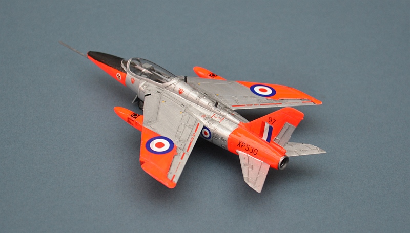 Only one decal option is provided, although the same kit has also seen release in equally colourful Yellow Jacks and Red Arrows display team markings. For this scheme, the combination of a metal finish and dayglo panels does not make for the easiest of paint jobs although it looks very good when finished. For the metal I used Humbrol Polished Aluminium and for the dayglo, Humbrol Flame Red over a base coat of white (I remembered too late that I had ben advised to use yellow as the base). Getting the orange even and solid when using a brush is not easy. I applied two well stirred coats; it could have done with a third, but was beginning to look a little thick.