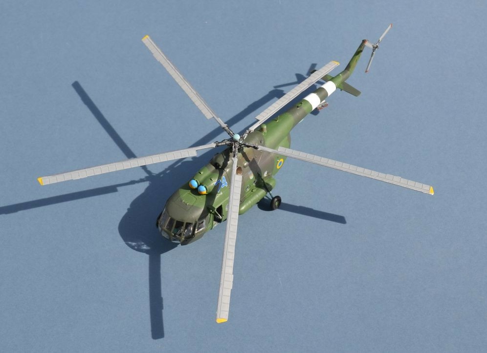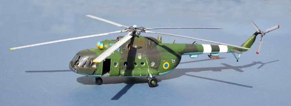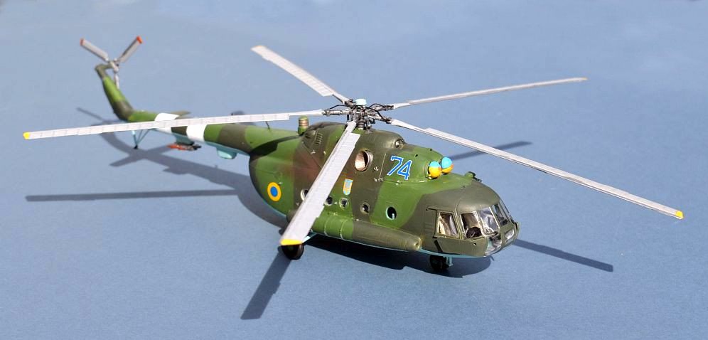 The Ukrainian Hips appear to exist in a very wide variety of camouflage schemes, from a more summery tan and green to wintery dark greens (my choice) and garish light/dark green mixes (why?). based on photographs, I have gone for Humbrol 75 Bronze Green for the darker colour and Humbrol 105 Marine green for the lighter. To reflec the many photographs, I added heavy exhaust staining using pencil lead and pastel powder. Decals are a range of spares from some of my previous builds.