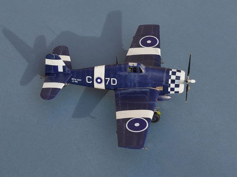 Paint is mainly Humbrol 104 Enamel, with two coats to provide even coverage, plus Humbrol 130 White for the detail parts. Kit decals are all for US Navy aircraft, so I have used the Freightdog “Brits at Sea” set for a set of relatively fancy markings for an aircraft of 808 Sqn just after WW2 ended. I can’t find out much more about this particular airframe, but the chequered cowl markings suggest to me that it is either a wing or squadron leader’s aircraft.